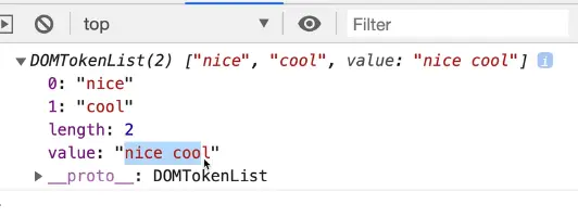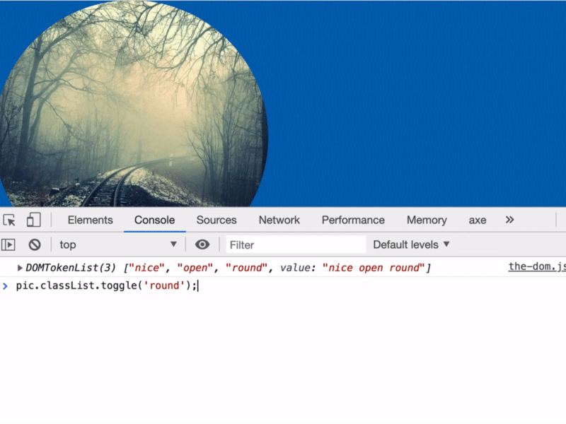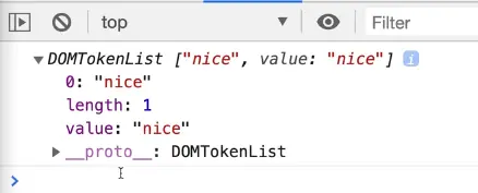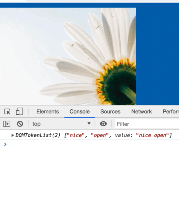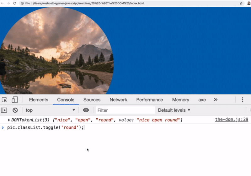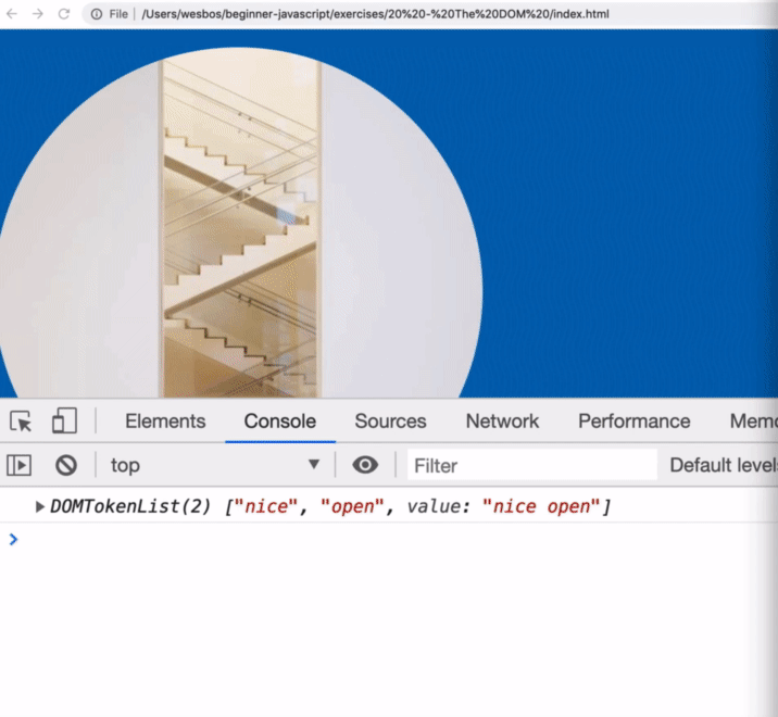 In the console we get a DOMTokenList which is kind of like an array of all the classes that are on that image.