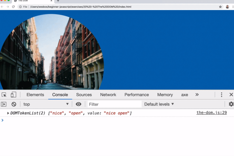 Within the-dom.js, add the following code to select the element using the class of nice, and then we will log the classList attribute of the element.
