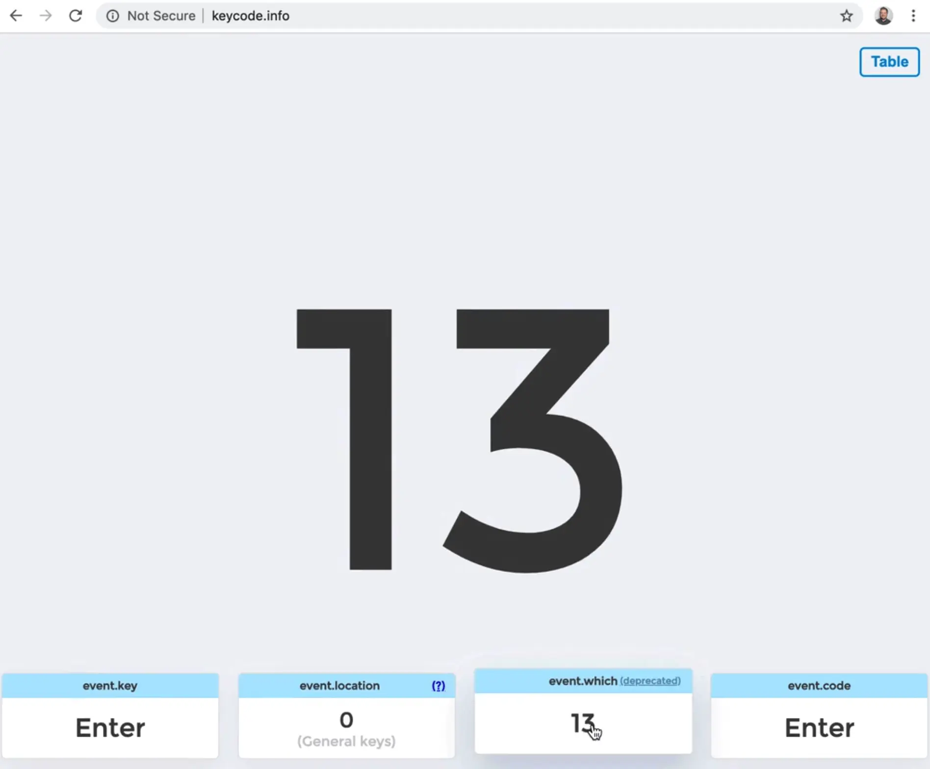 Wes has a website, http://keycode.info, on which you can press any key and it will give you the meta information about that key.