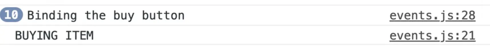If you refresh the page, you will see the "Binding the buy button" text was triggered 10 times and if you click each of the buttons, you should see the text BUYING ITEM logged 10 times.