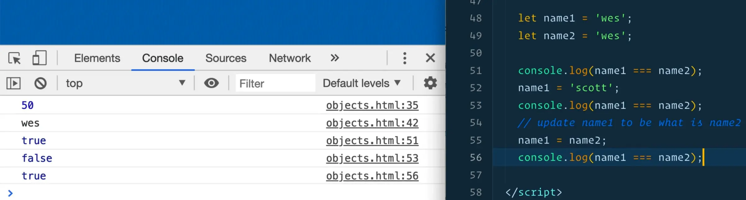 Let's say you have the following 2 variables, both assigned the value of 'wes' 👇