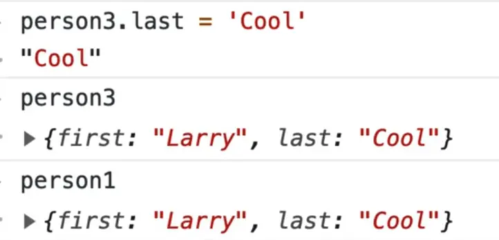 In the console, let's try updating person3.last like so: person3.last = 'Cool'. So person3.last should now return "Cool", but what about person1?
