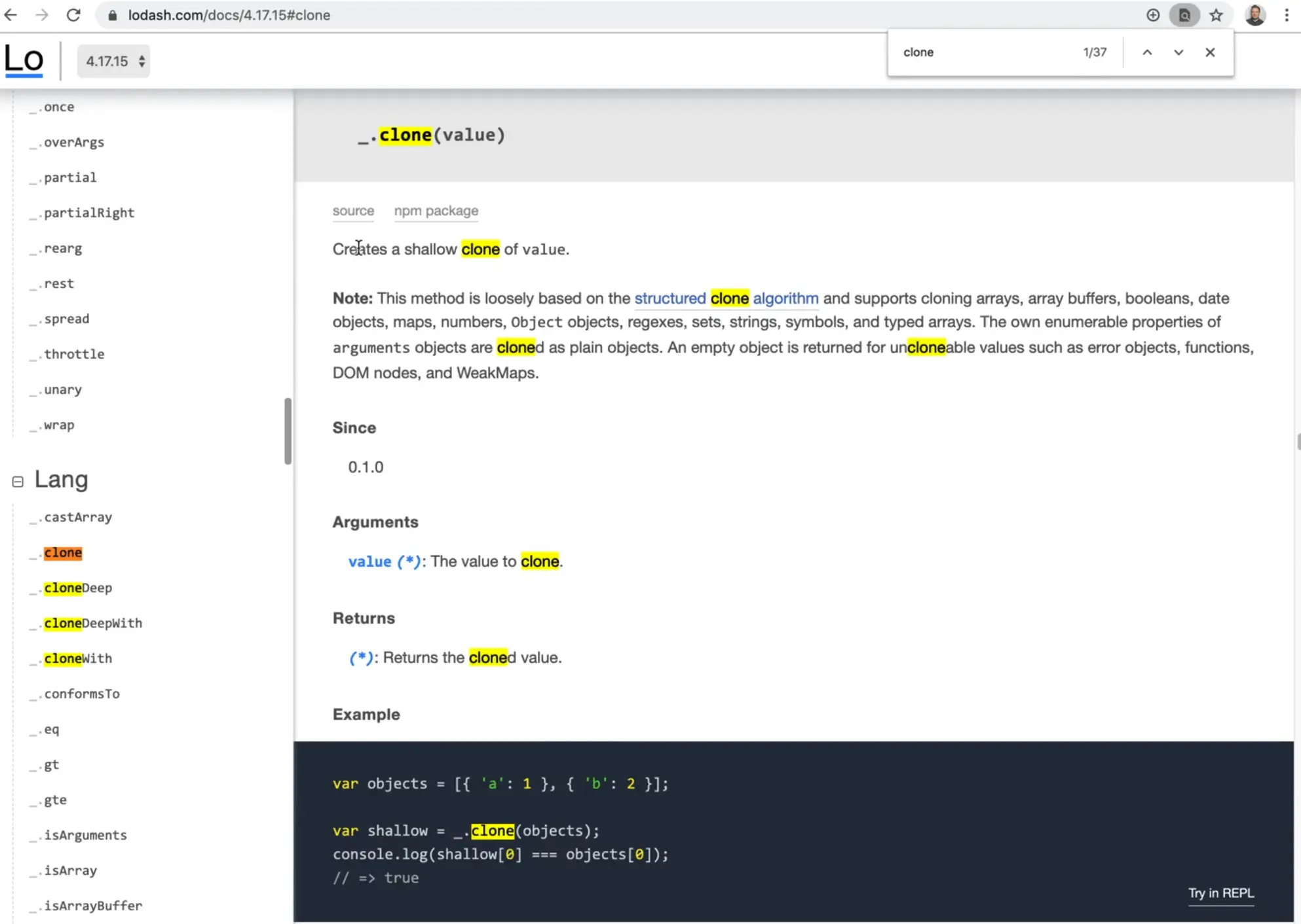 The documentation also provides an example of how to use the method. You would use it by calling _., which is where all the lodash methods live, and then calling .clone().