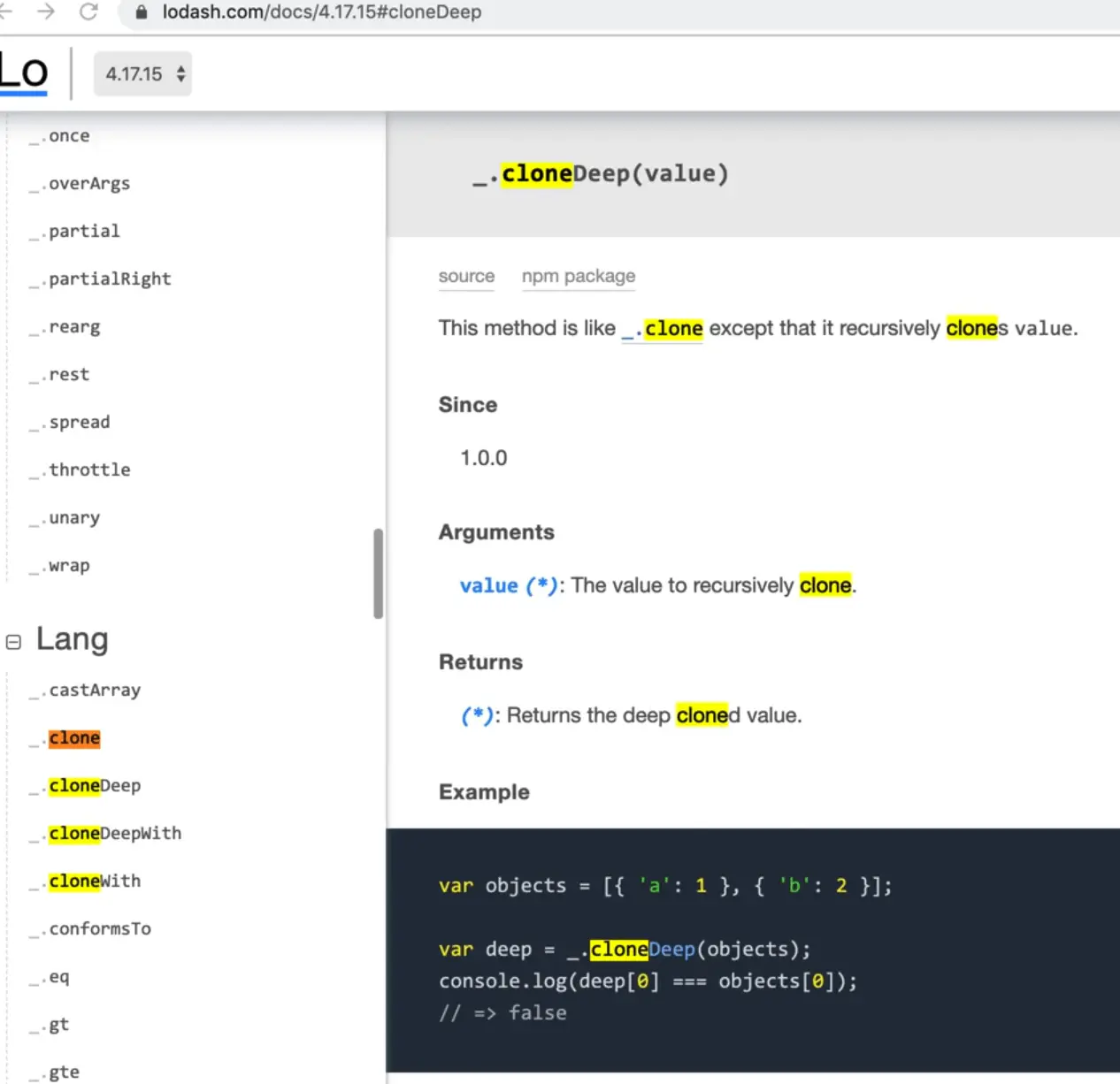 It has a lot of methods that are used when working with objects and arrays. One of those is for doing copies of objects. Let's take a look at the documentation by searching for the keyword clone on the website.
