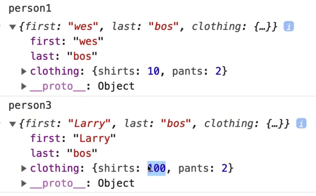However if you look at person1, you will notice that person1.clothing.shirts was also updated to be 100.