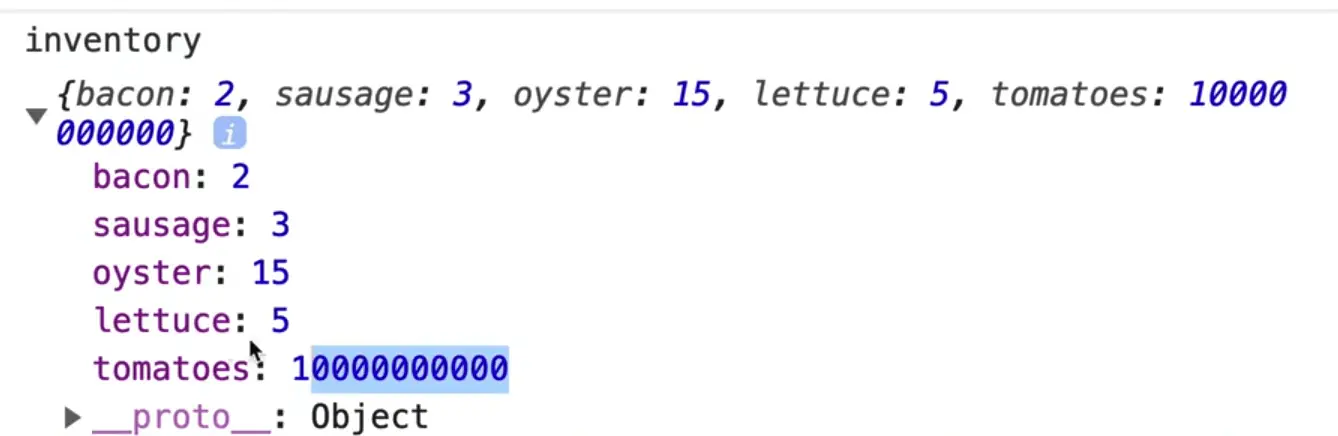 However, if you type in inventory, which is the object that lives outside of the doStuff2 function, you will see that it also contains the tomato property.