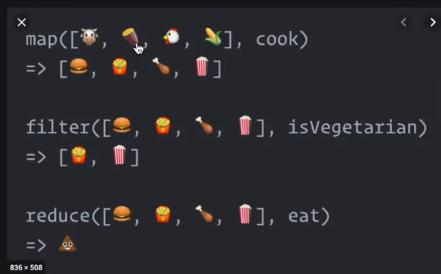 The map function in the image above takes in raw materials of cow, potato, chicken and corn and that returns the cooked materials via the cook function.