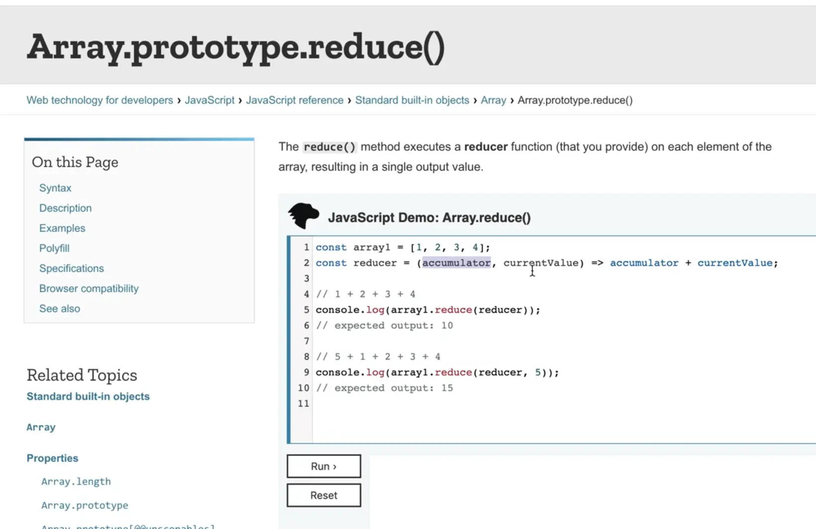 .reduce() is probably one of the trickier array methods to understand because it does so much and there are a couple of different use cases for it.