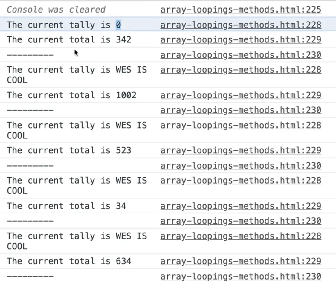 As you can see, the first time the loop runs, tally is 0 because we started with an accumulator of 0 and then for all the next instances, our accumulator tally is equal to "WES IS COOL" because whatever you return from this function is what the accumulator is equal to.