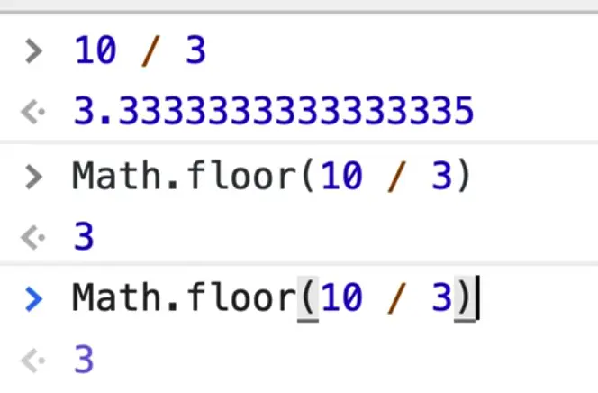 If you try to divide 10 by 3 you get 10 / 3 = 3.33333333335. Well you can't really split a smartie into thirds. You might think we can use Math.floor(10/3) which does return 3.