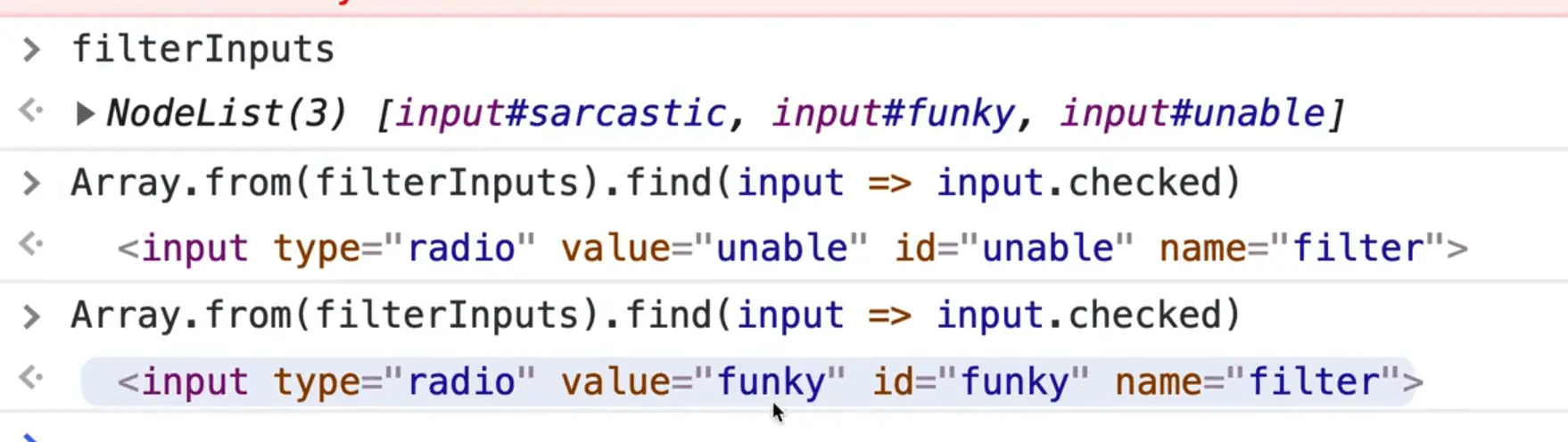 That is because filterInputs is a NodeList, not an array. We could wrap it in Array.from and then call find like so 👇
