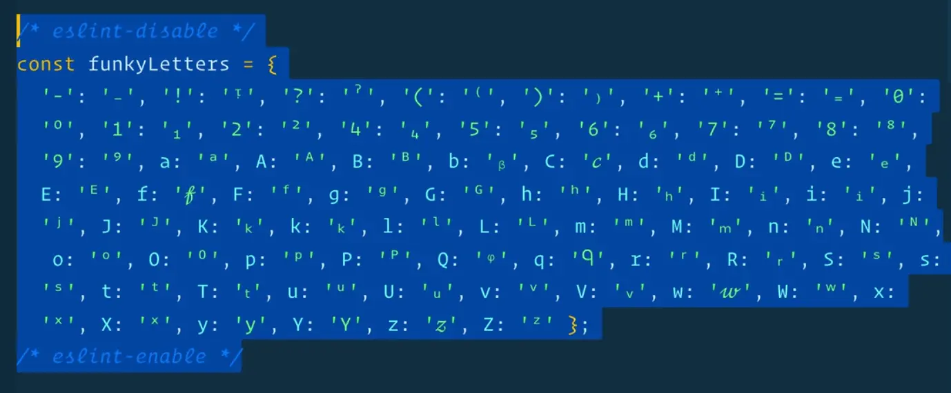 This object is just a lookup of letters that match to funky letters.