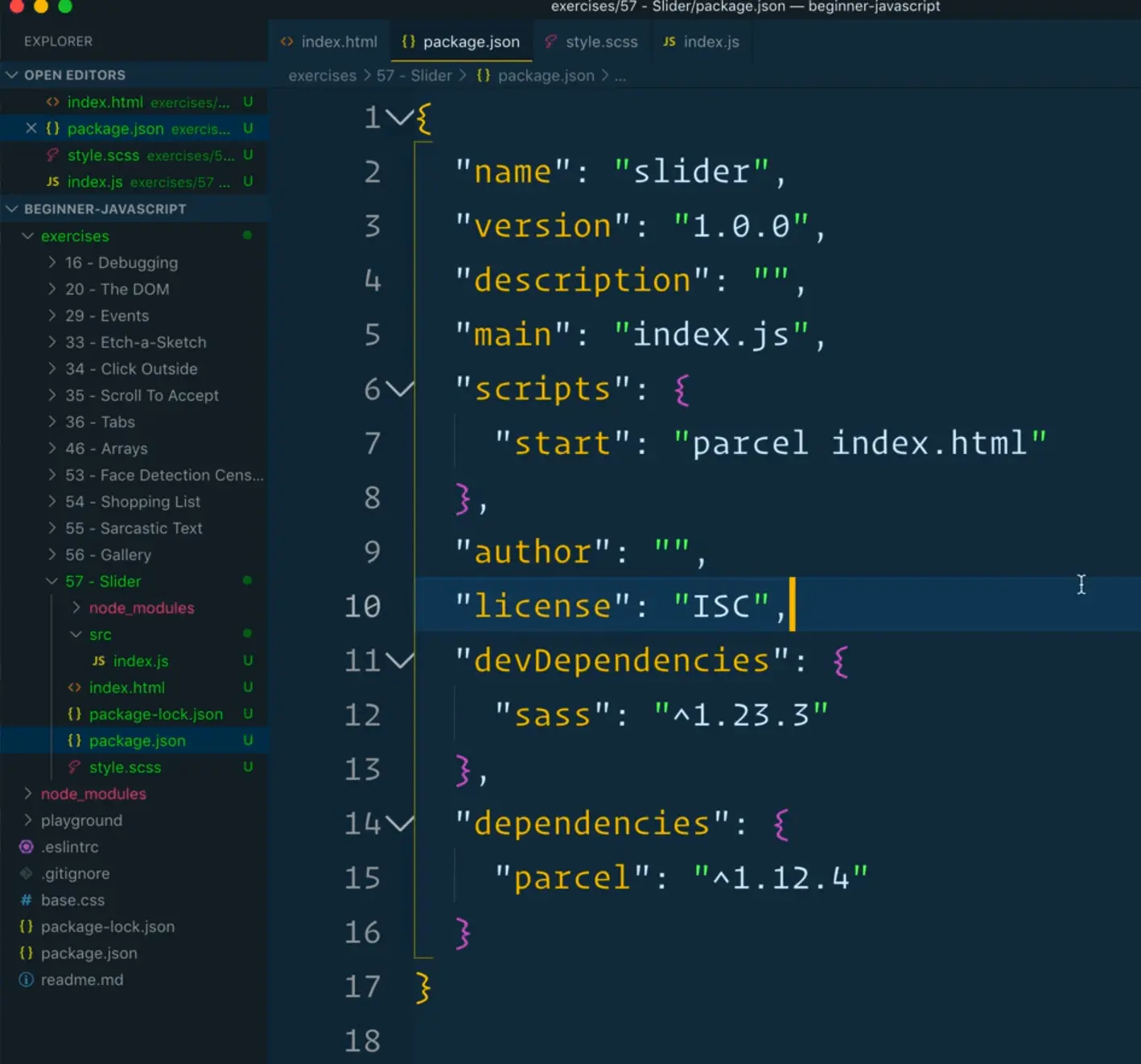 You will notice that we have 2 dev dependencies, one for Sass and one for Parcel. When we type npm start, that will run the parcel index.html command.