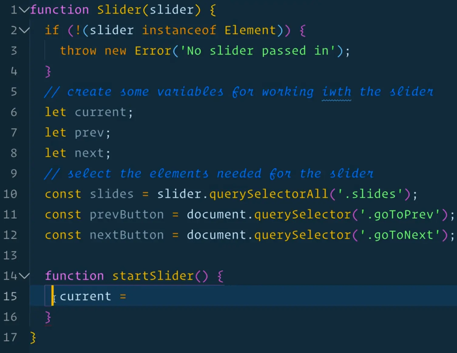 We will set the value of current to be the slide that contains the class of "current" or if no slider has a class of current, we will get the first element child of slides.