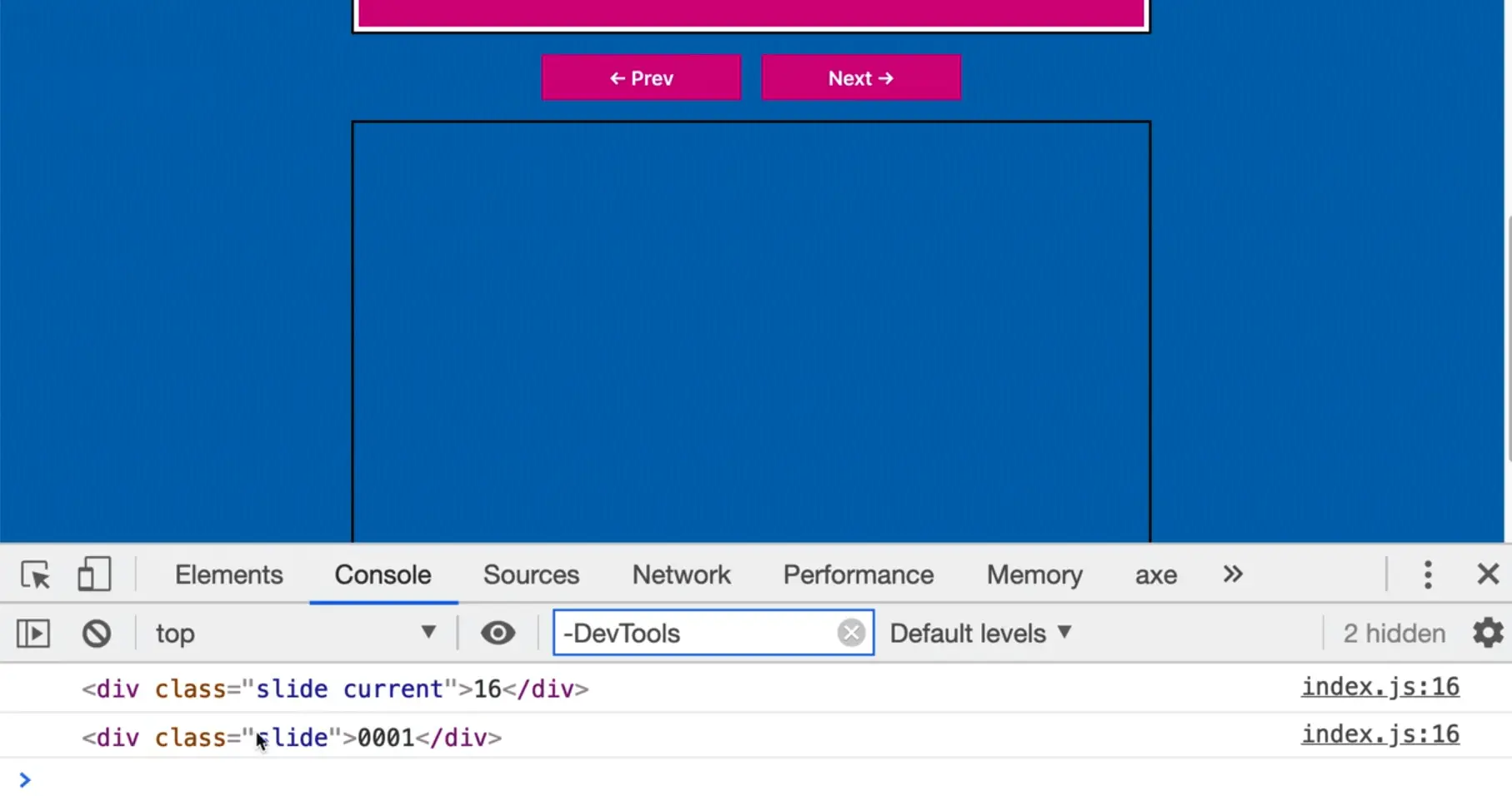 If you refresh the page you will see that we now have both of our slides logged in the console. The first slide starts at 16 because it has the class current on it and the slider had no class of current on any of the slides so it started on the first slide.