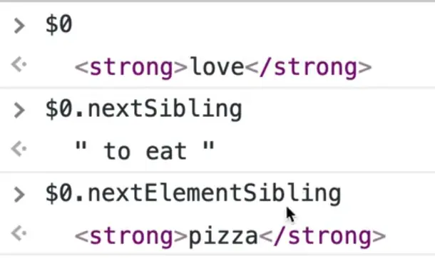 What is the difference? nextSibling gives us a Node, and a node can be text or an element, whereas nextElementSibling will only return elements. Always use elementSibling when you are looking for an element.
