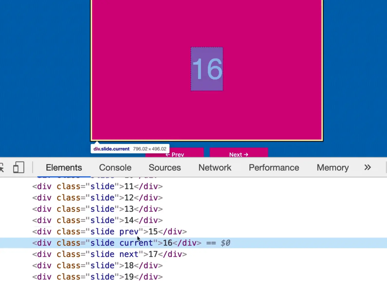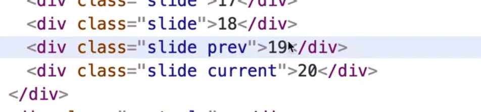 If we look at the HTML structure of the slider within the element tab of the dev tools, you will see that we have all 20 slides. Now as we hit the next button and previous buttons, the classes are actually changing on the sliders depending on what button you press.