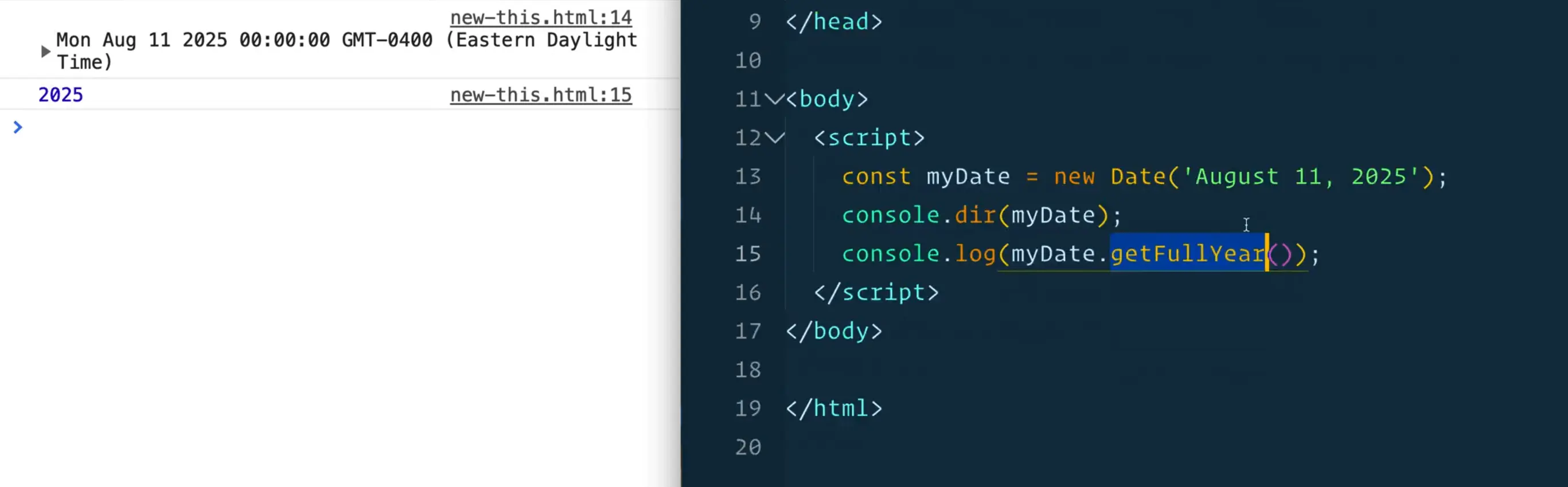 Let's say you were to log myDate.getFullYear(), you will see we get 2025 in the console.