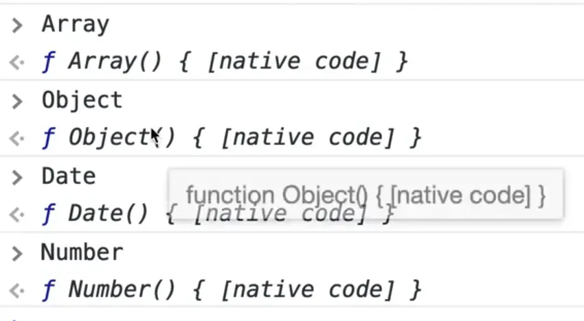 If we take a look at all of the types that we have by entering them into the console, such as Array, Object, Date, Number you will see that they are all just functions, which if run with the new keyword in front of it, will return a new object.