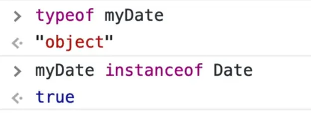 Because we are creating a new Date, we have this variable myDate which is an instance of date. If you were to type into a console typeof myDate, it would return an object. But if you were to type myDate instanceof Date it would return true.