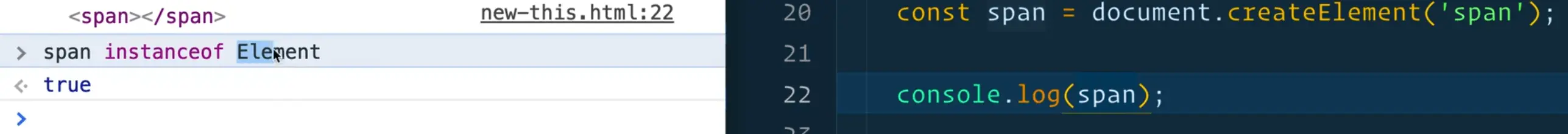 If you tried to check whether span was an instance of an element you could do span instanceof Element which should return true because Element was the base one and span is the instance that we created.