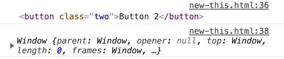 Let's log the value of this within the timeout, refresh the page and click the second button and then look at the console. You should see the button logged and then the window.