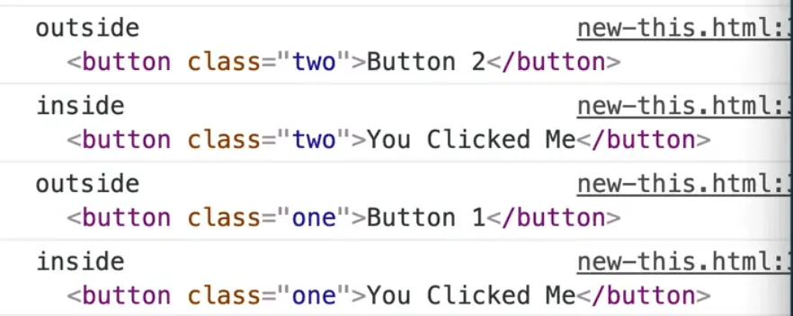 Now when we go and click on each button, the this keyword will be equal to each button that was clicked.