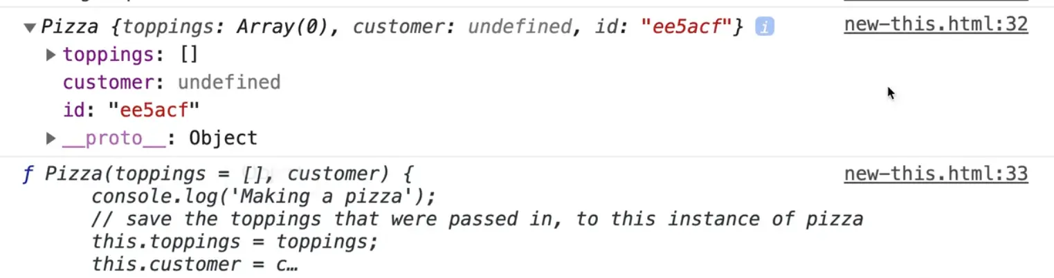 In the next video we will go into prototypal methods that can be shared amongst all the pizzas, because they always do the exact same thing.