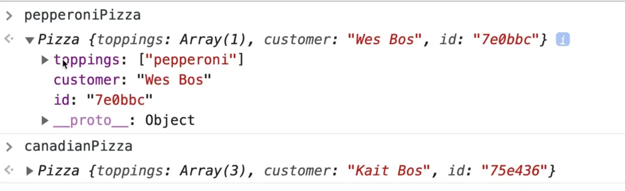 The toppings and customers are empty and undefined because we haven't passed them in. So let's update pepperoniPizza to add some toppings and a customer and then add another pizza as shown below 👇