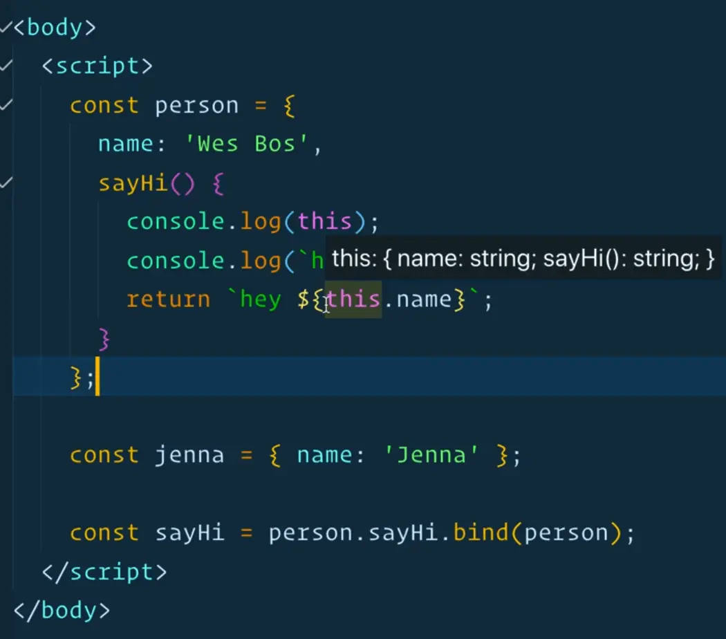 const sayHi = person.sayHi.bind(jenna);