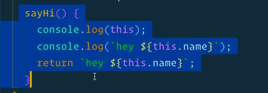 The sayHi method will give us the object it was run against. This is no different than if we were to have class or prototype. The this is going to be equal to whatever was to the left of the dot.