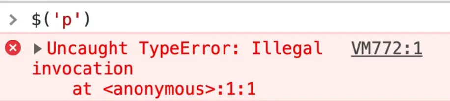 Now if you wanted to actually select something, you might think you would be able to just do $('p'). However, if you try that you will see that we get an error complaining about "Illegal invocation".