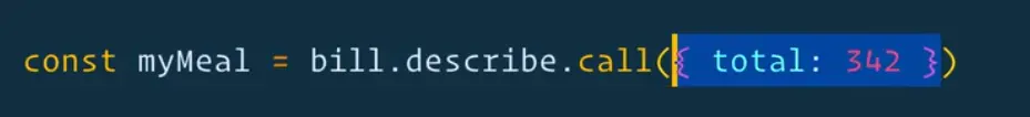 const myMeal = bill.describe.call({ total: 342 }, 'pizza', 'beer', 0.13);