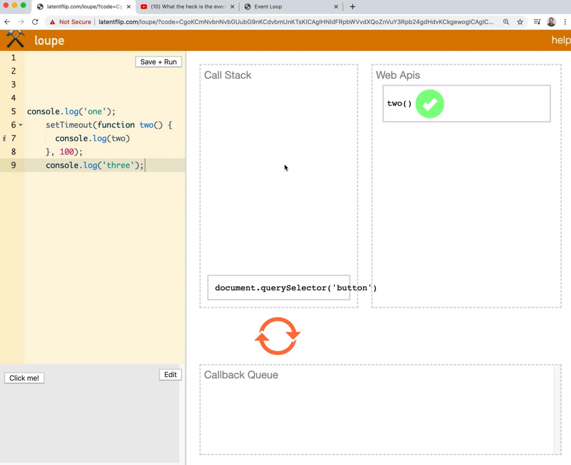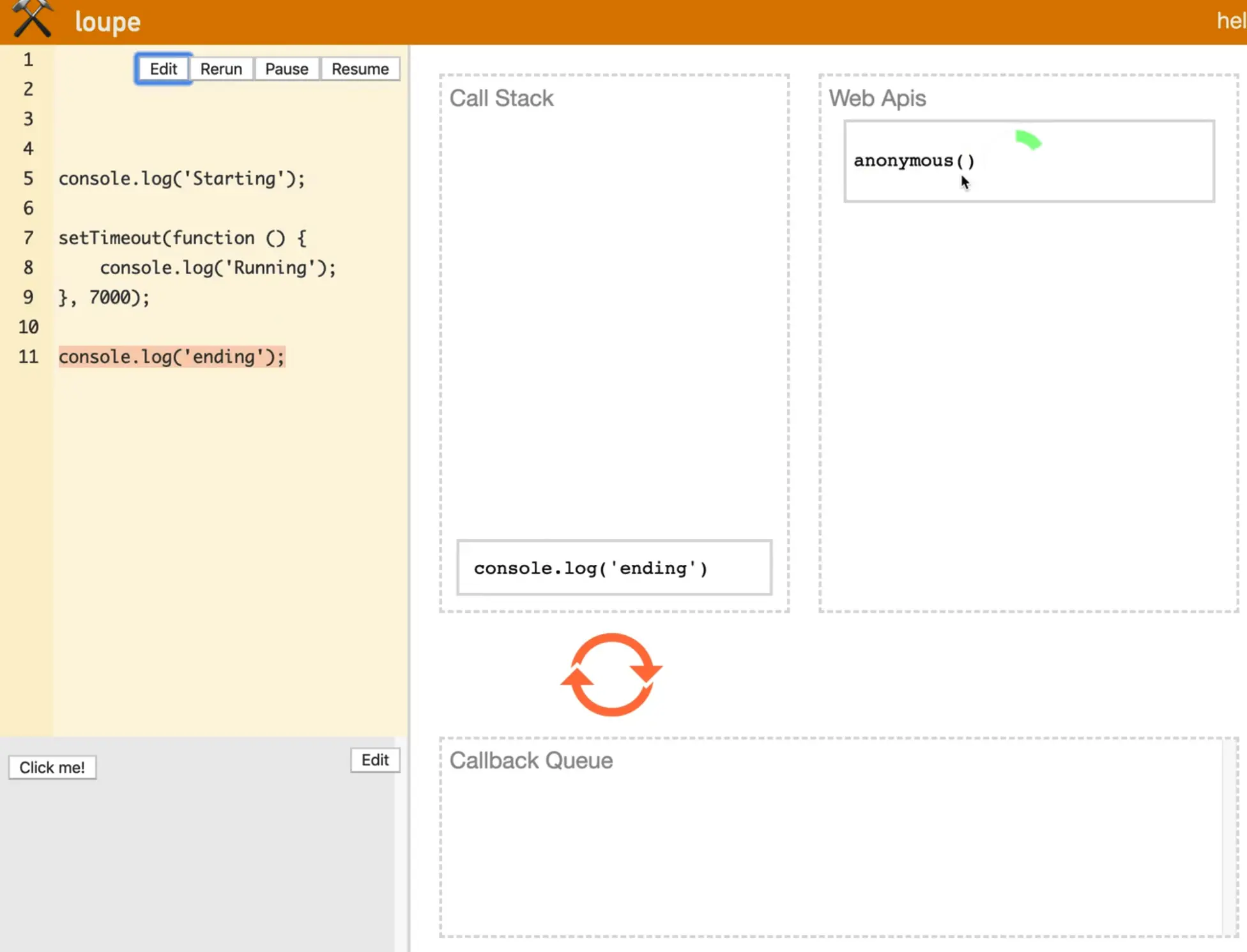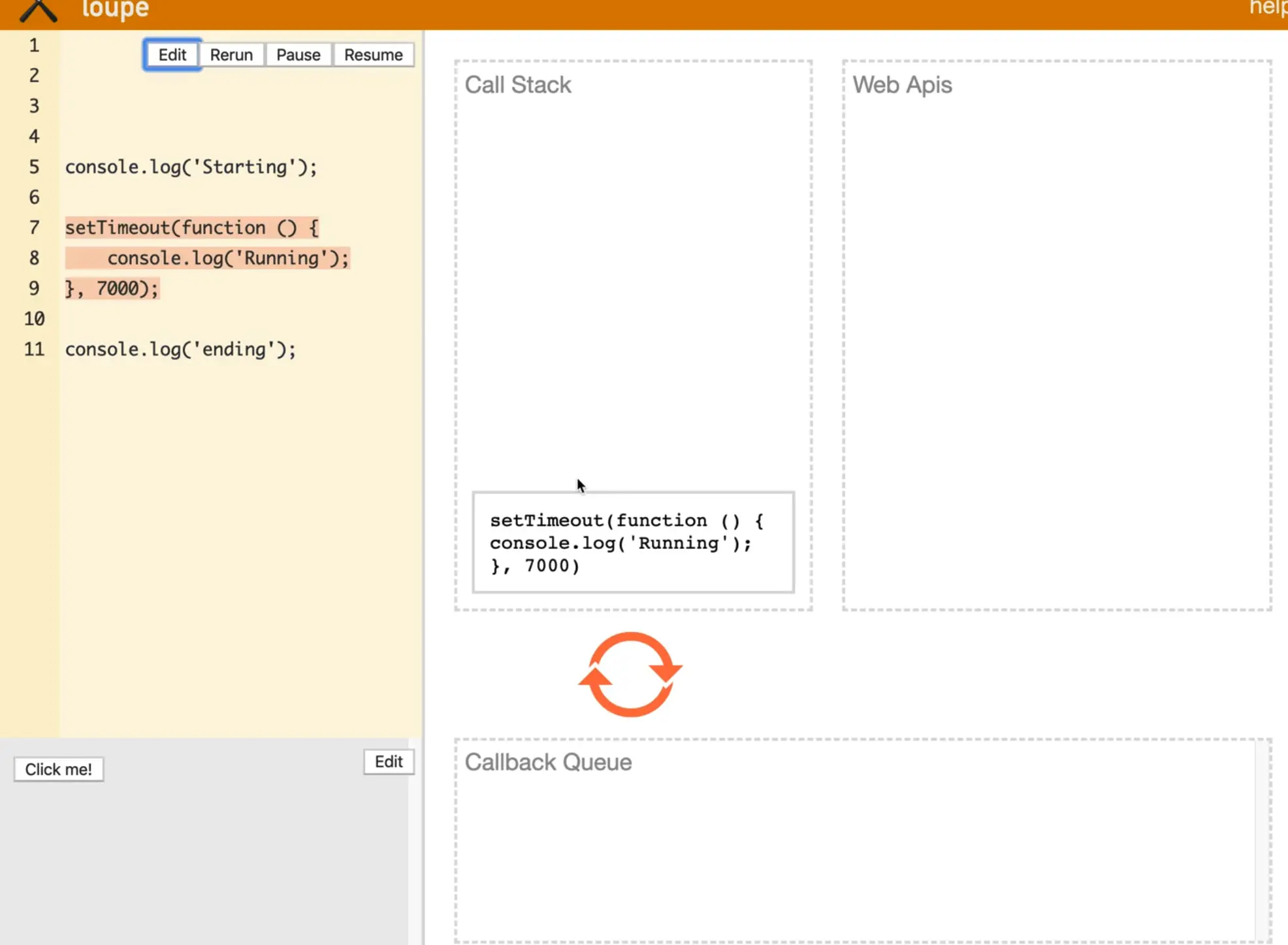 Let's run the default example on loupe that is supplied to demonstrate what happens when multiple things are queued up.