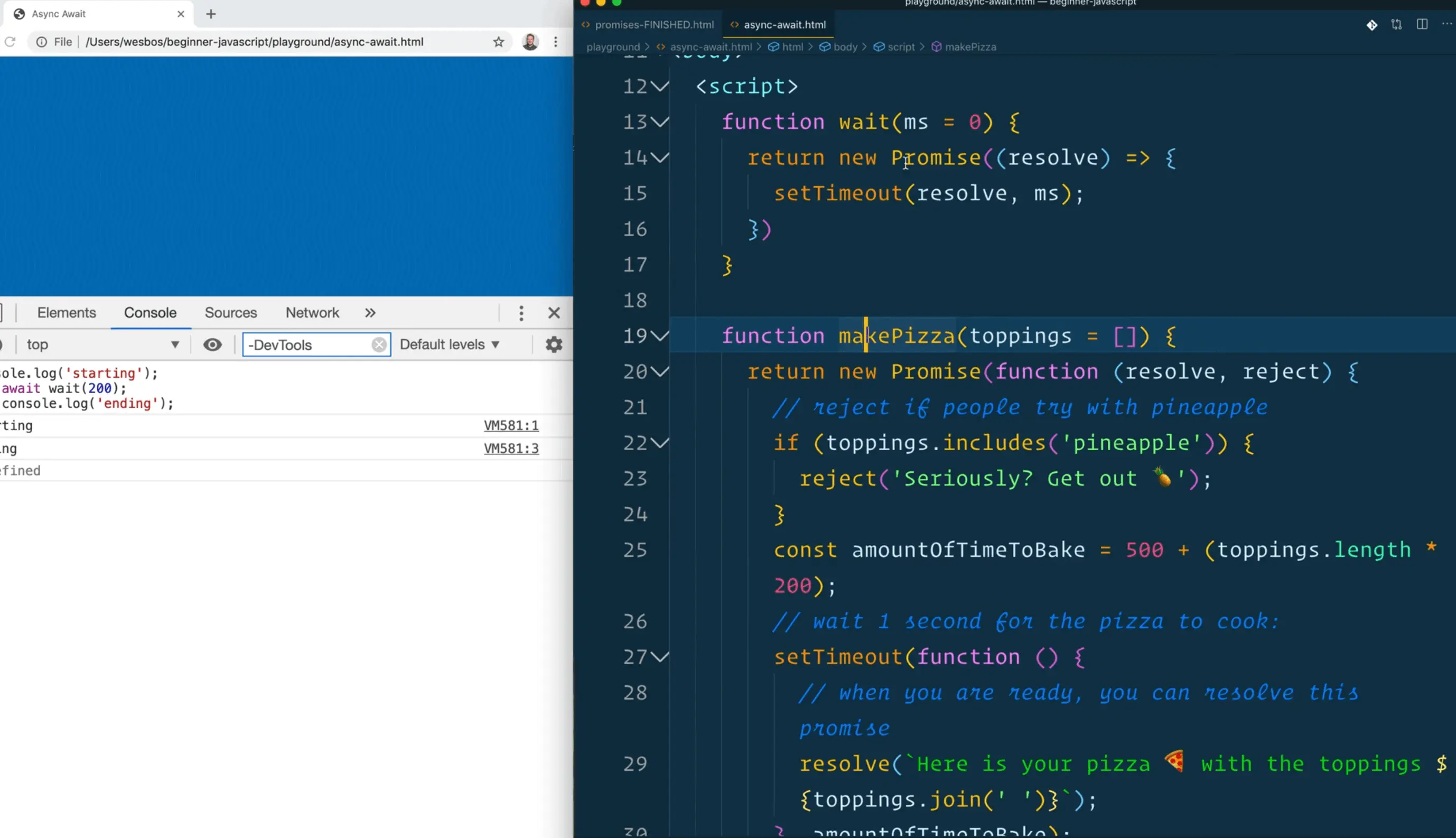 Go to our promises.html file that we have and let's grab the makePizza function, and move it over to the async await file.