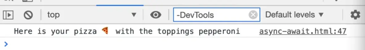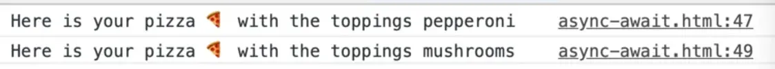 If we instead put an await in front of our makePizza function, we will asynchronously be waiting for the pizza to be done, and when it is, we will simply log it.
