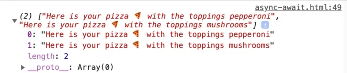Now we get the actual pizzas instead of just the promises. Go ahead and destructure the two pizzas that are returned.
