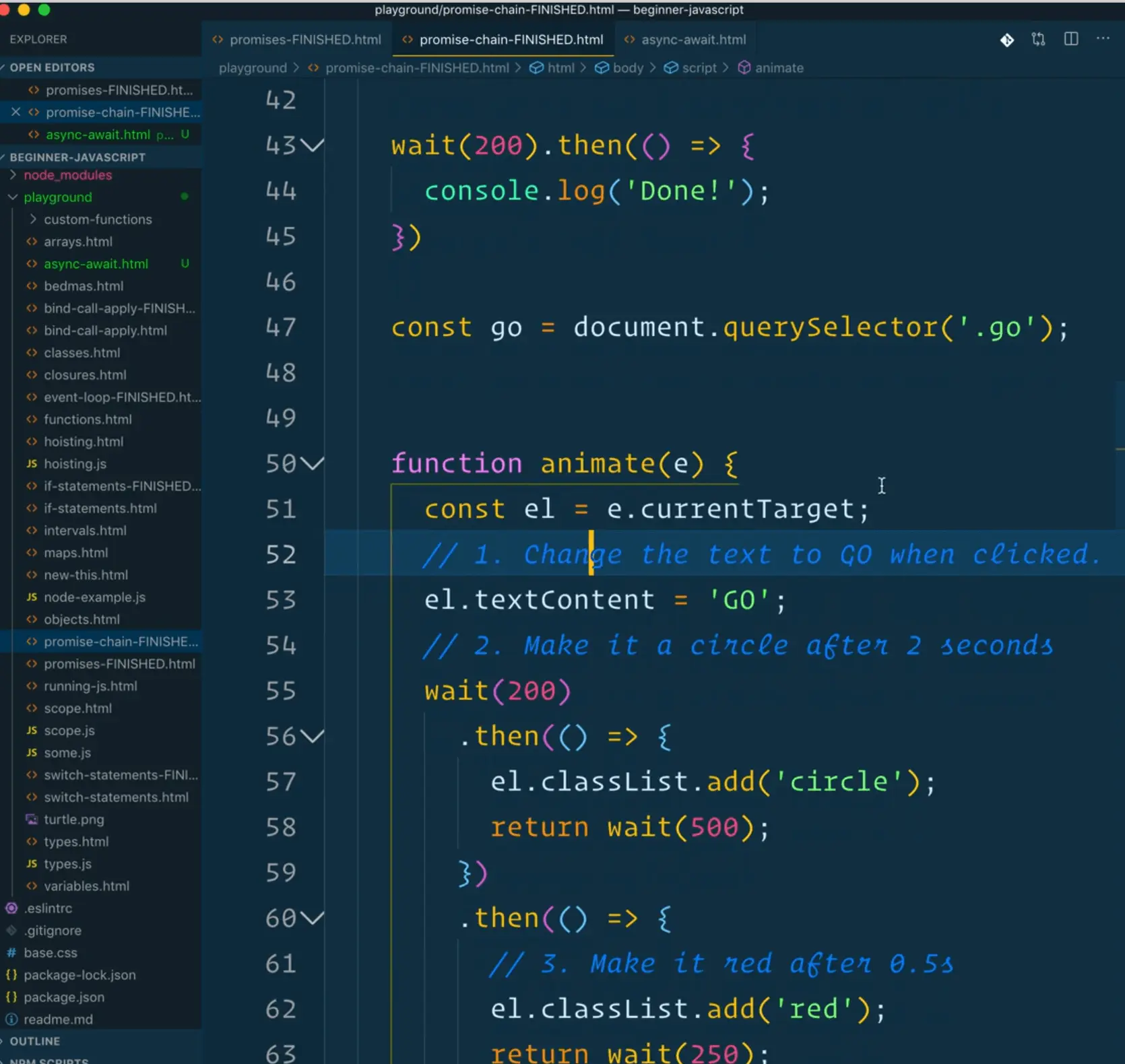 Open it up in the browser to make sure that it still works. Then refactor the animate function to instead await as shown below.
