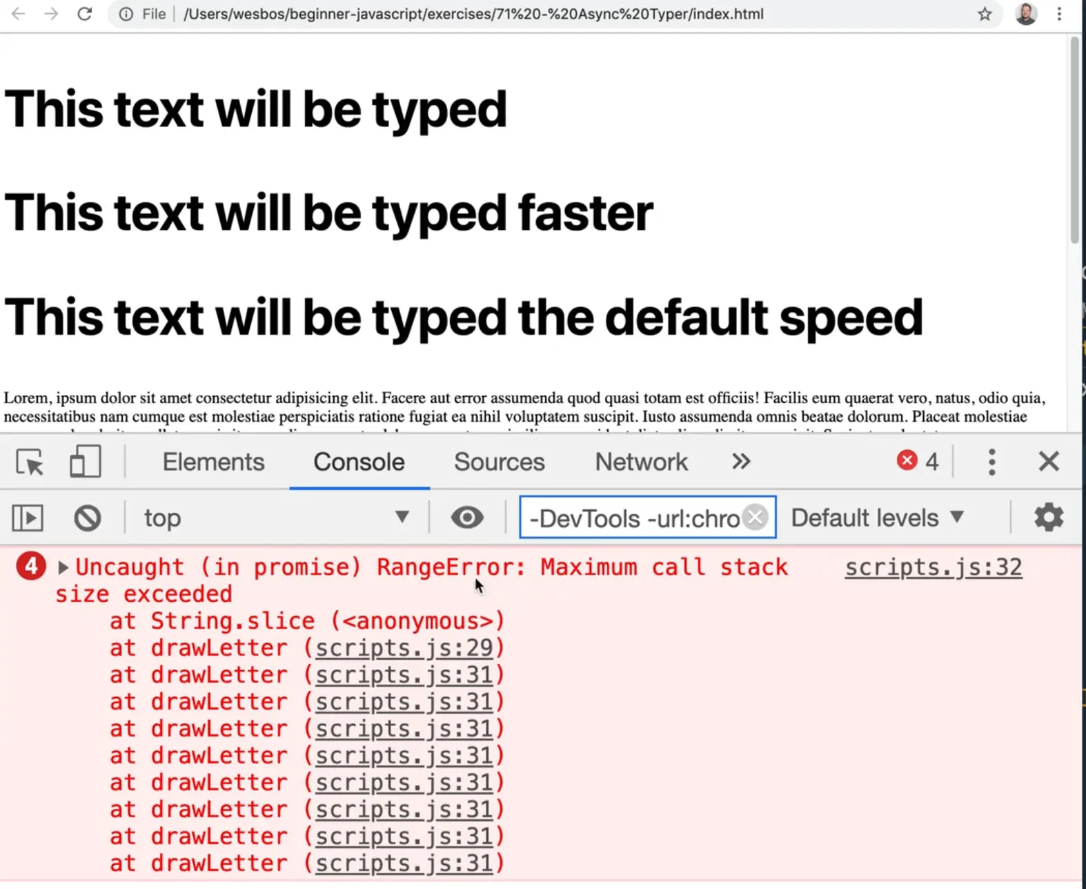 What is happening is drawLetter is calling itself over and over again and eventually the browser complains that you have added too many things to the call stack.
