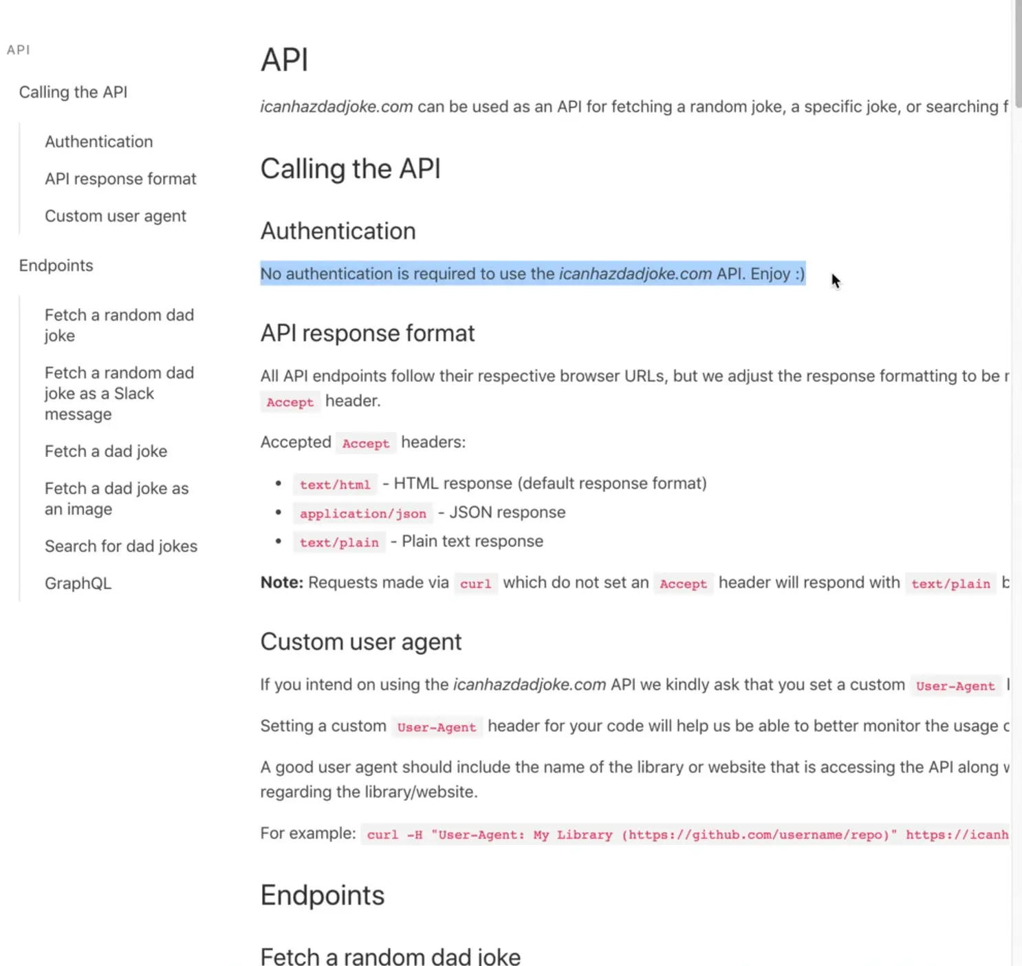 Let's look at the API docs for fetching a random joke.