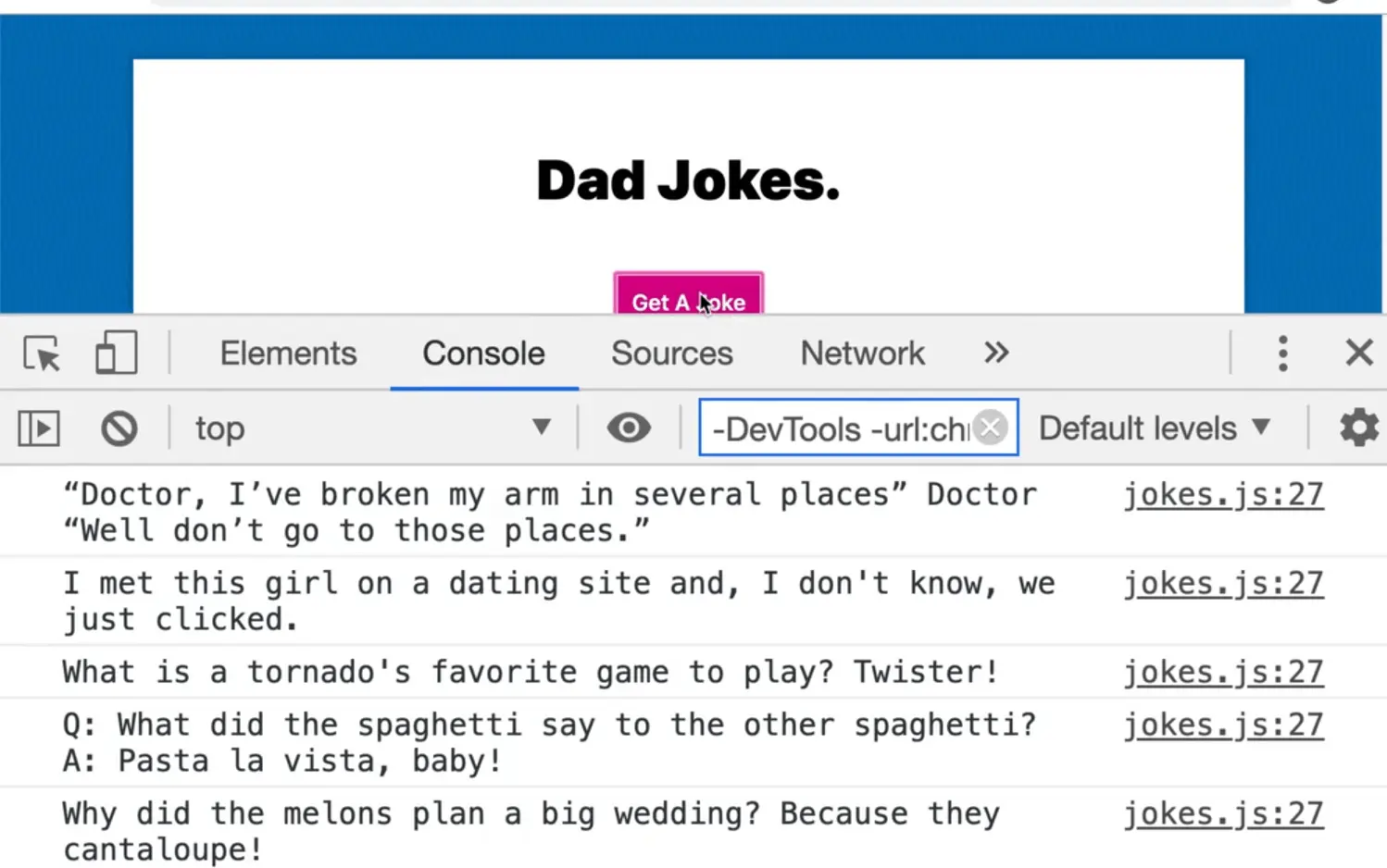 Now when you refresh the page and open the console, you will see that every time we click the button, a new joke is logged.