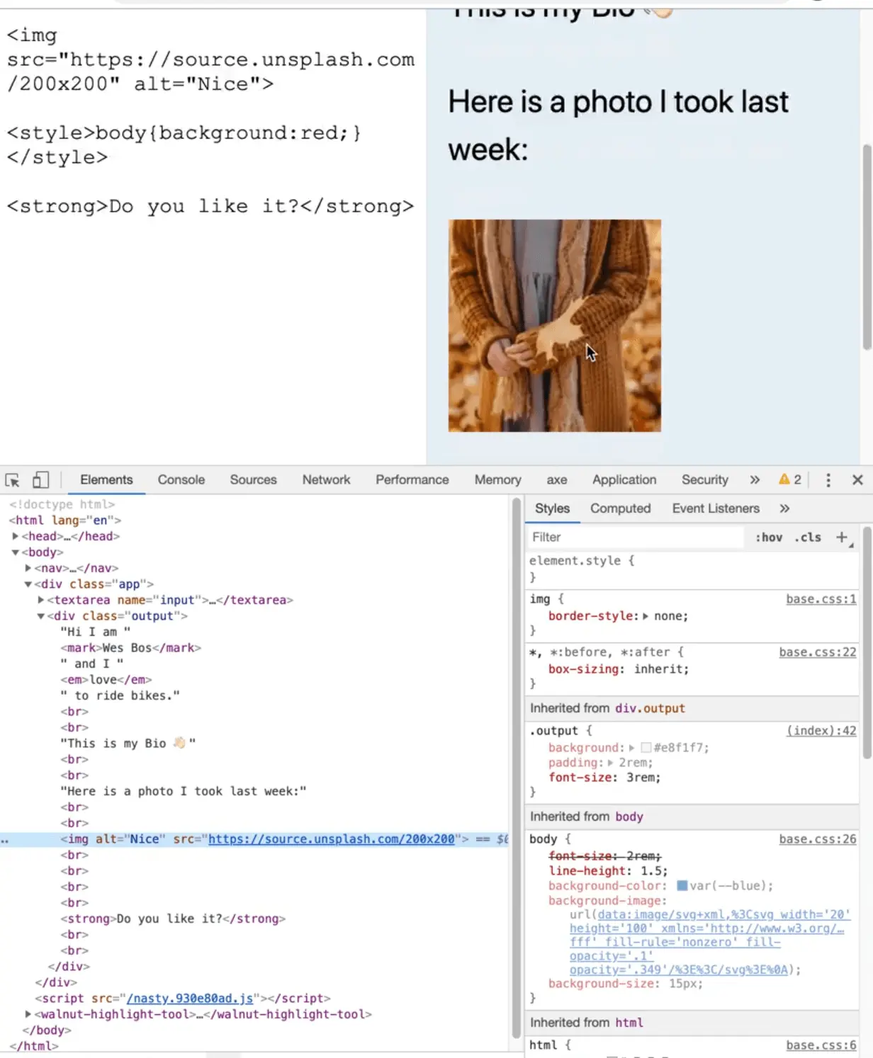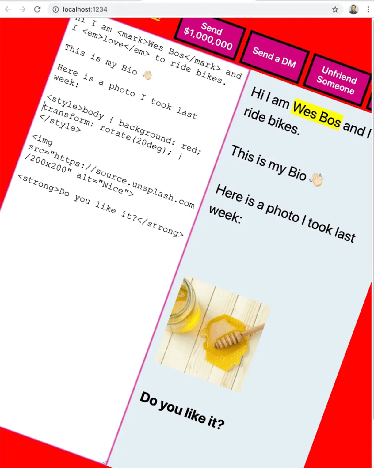 We could do something like add a style tag and make the background red. Then we can tilt the entire page.