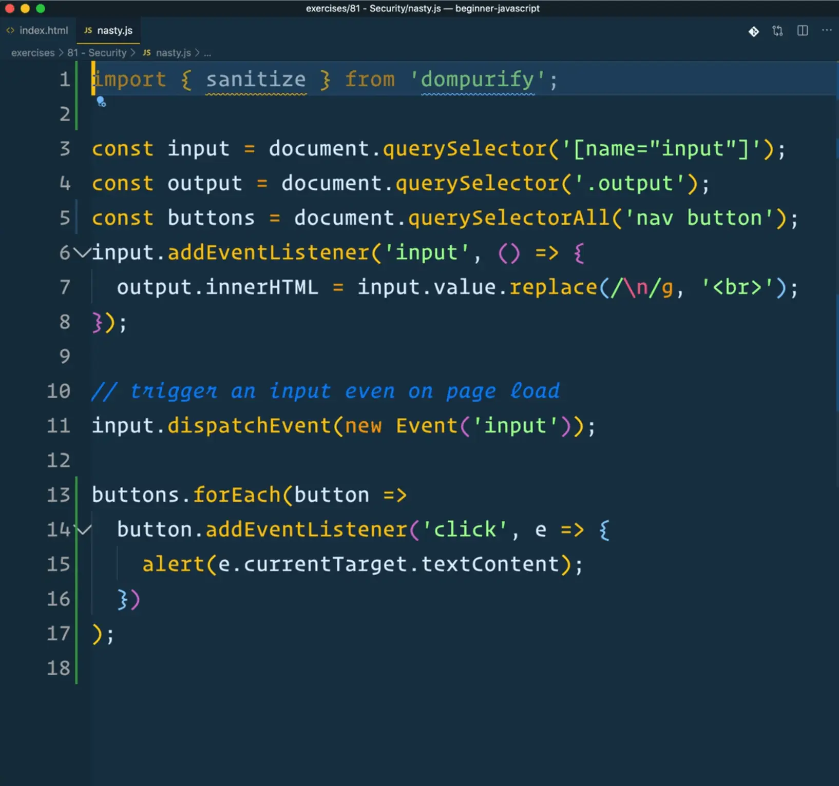 Wes has already npm installed DOMPurify, and at the top of the file he has imported the sanitize method from DOMPurify.