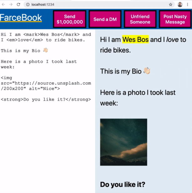 Wes has created this little example to demonstrate the concept of Cross Site Scripting (XSS) called FarceBook.