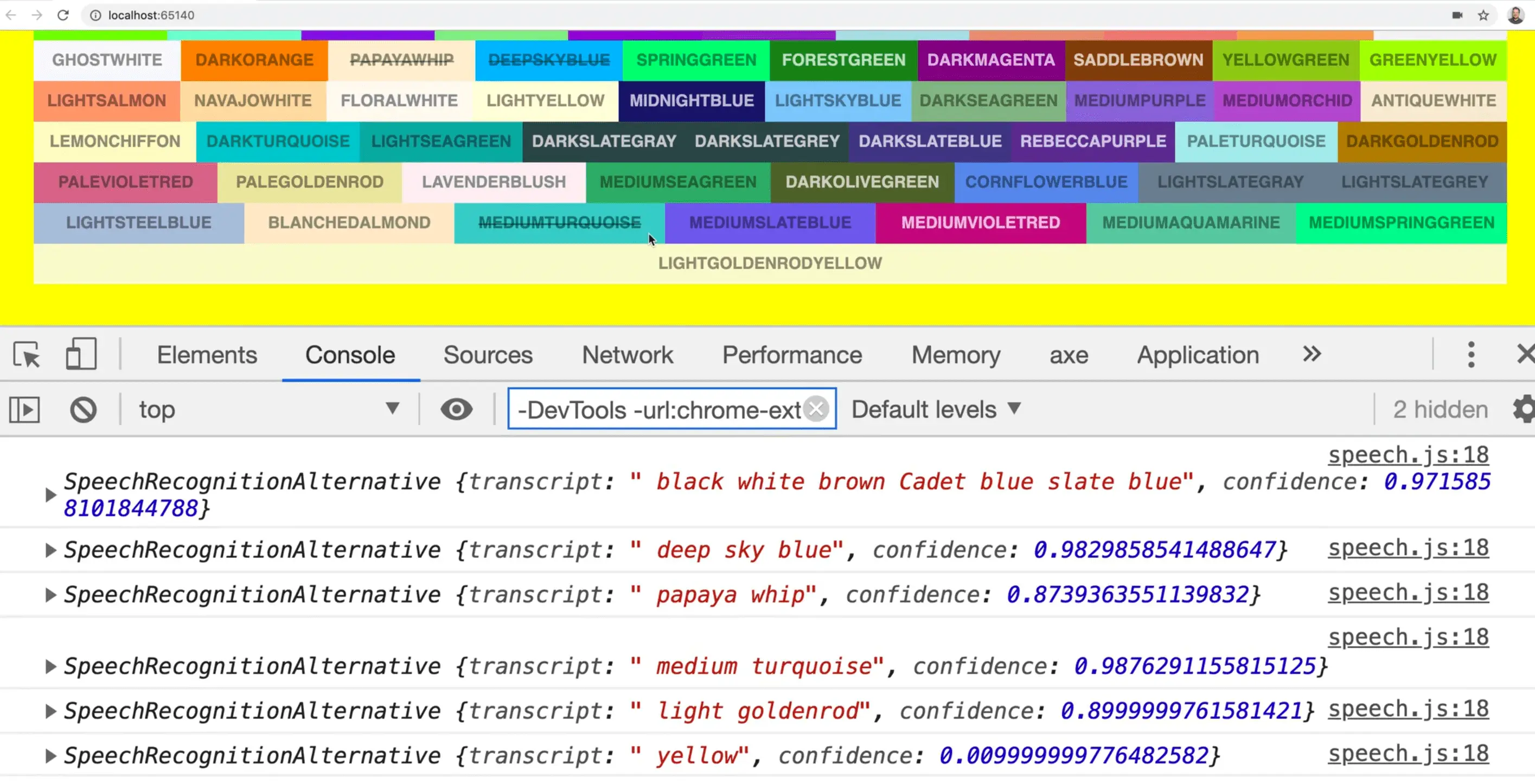 If you try speaking the color red when the page refreshes, you should see the red color span logged.