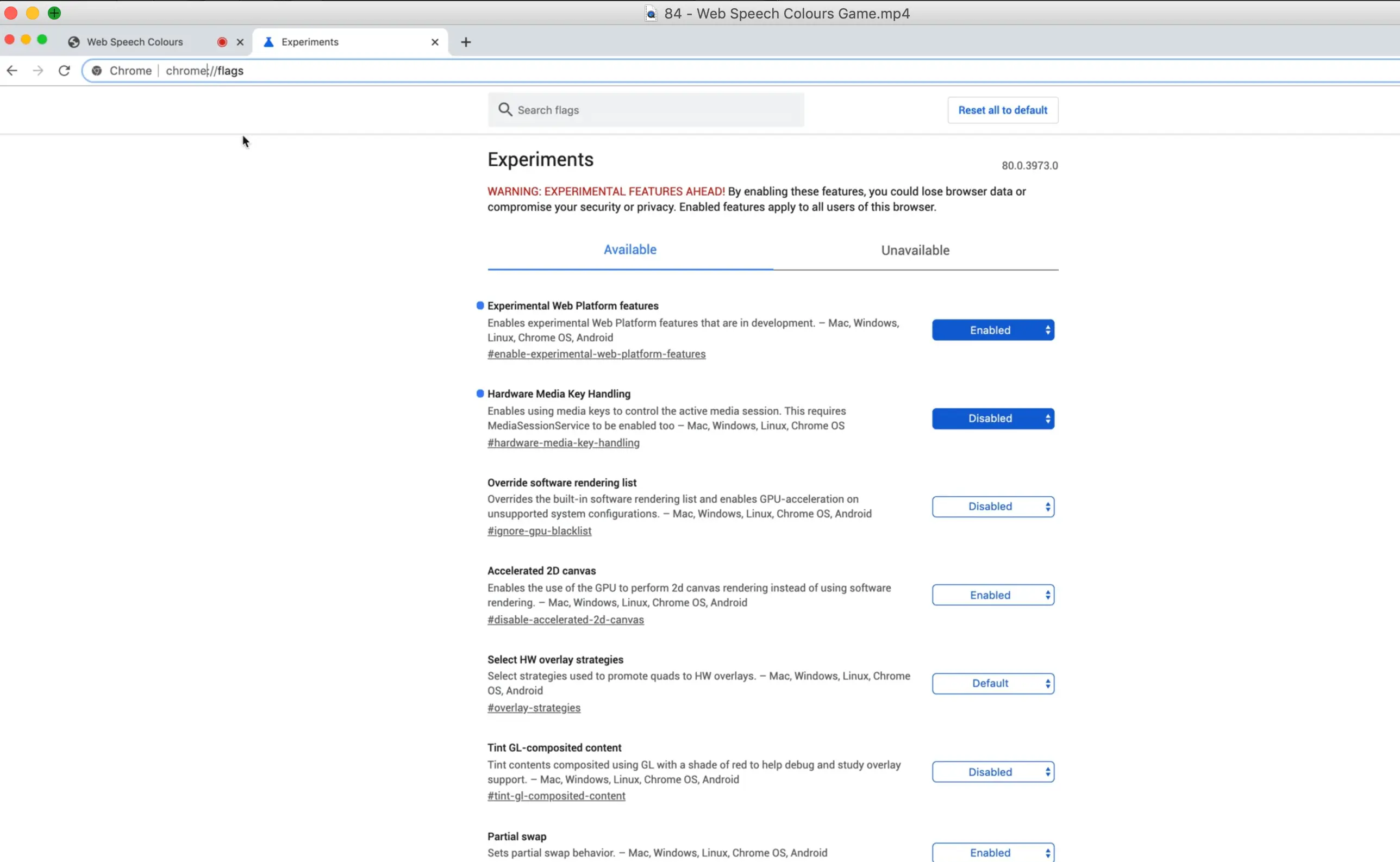 Let's start by opening chrome and navigating to chrome://flags in the browser. On this page, we need to make sure that "Experimental Web Platform features" are turned on.