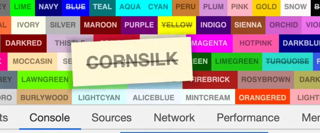 Wes has given us colors.js which gives us an object containing every color that is available in CSS, and it's corresponding hex code.