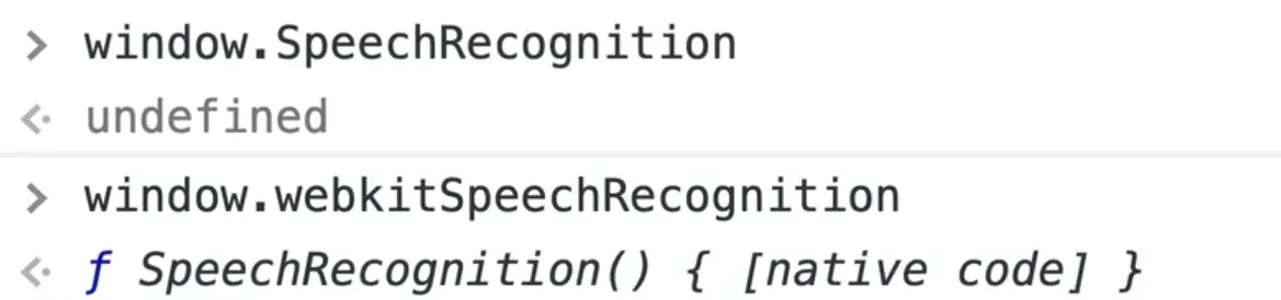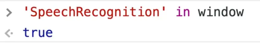 We need to check if there is something called window.SpeechRecognition. However if you try to reference that in the console, you will get undefined because it is actually window.webkitSpeechRecognition.