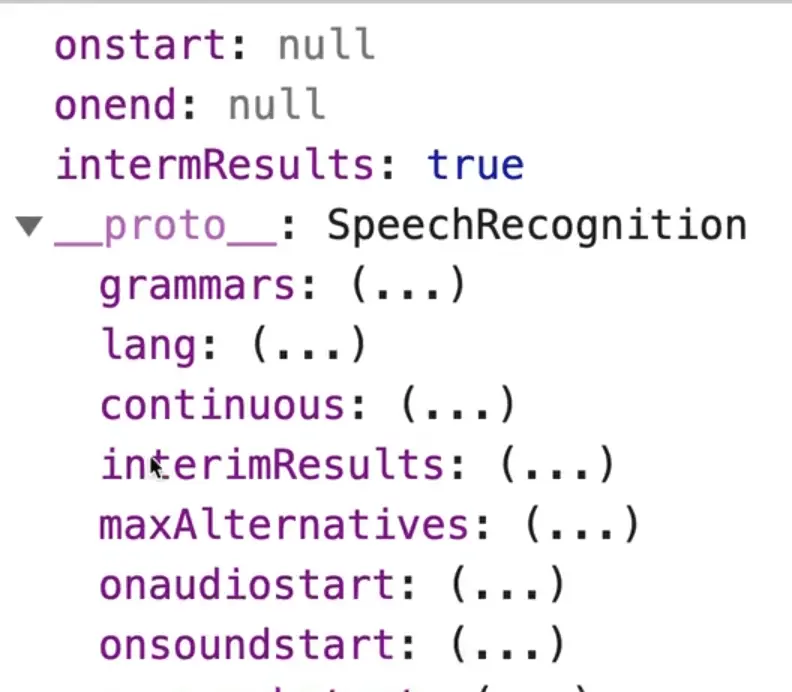 This is a little bit different than most event listeners because normally you would add .addEventListener. but if you try to log the recognition variable and look at the prototype, you will see there is no method like addEventListener.