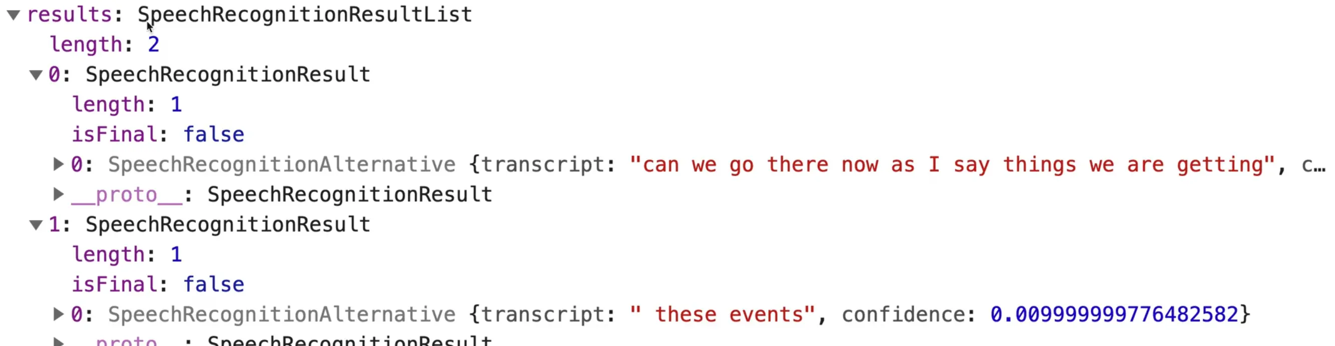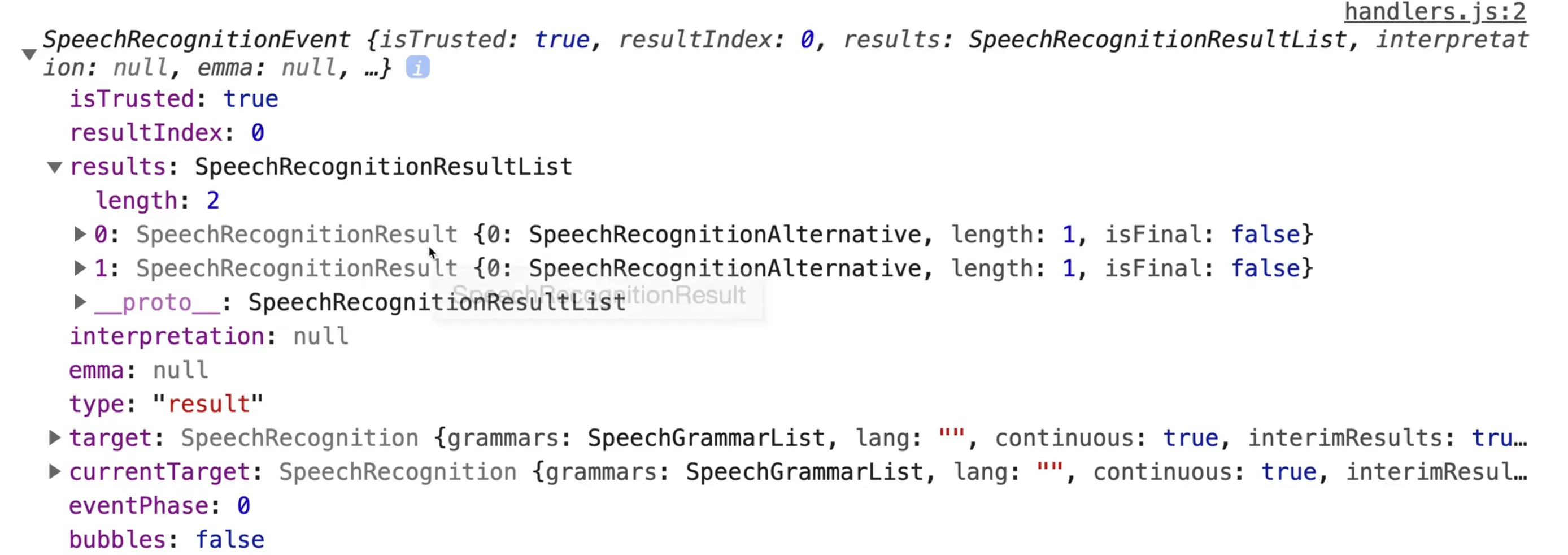 If you open up one of the SpeechRecognitionEvents that have been logged in the console, you will see it is very similar to an event object.
